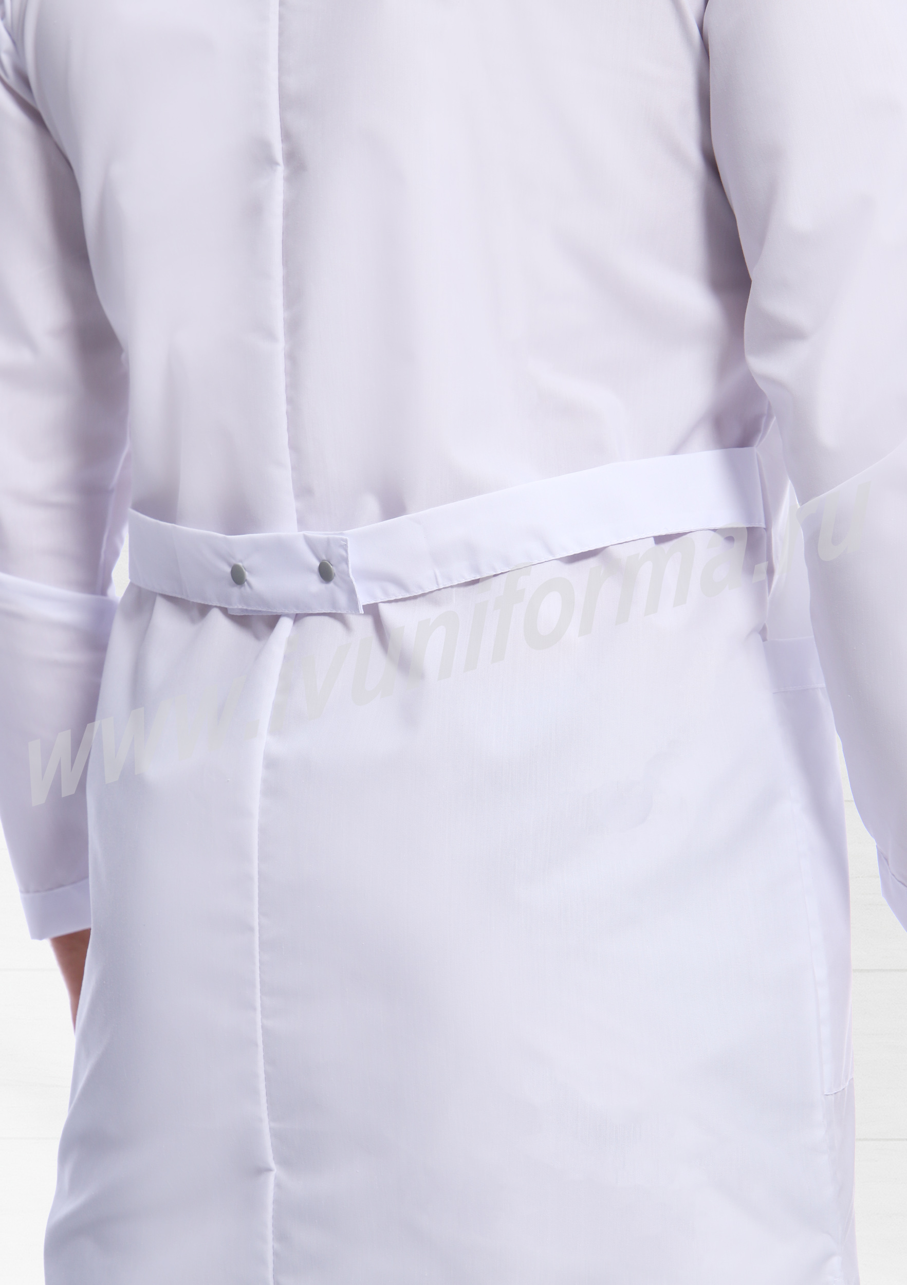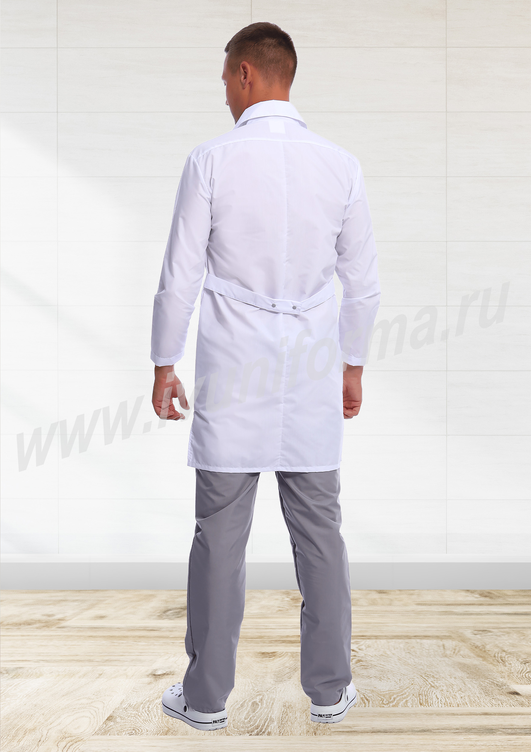 Халат мужской прямого силуэта средней длины с центральной бортовой застежкой на кнопки. Полочки с отрезными кокетками, декорированными отделочным материалом, вместительными накладными карманами в нижней части и нагрудным карманом с отделкой из контрастного материала на левой полочке. Спинка с отрезной кокеткой и средним швом. Объем по линии талии регулируется полупоясами с фиксацией на кнопки. Воротник классический. Рукав втачной длинный. В боковых швах халата предусмотрены разрезы, обеспечивающие свободу движений. Халат прост в уходе, практичен и удобен, предназначен для медицинских работников.